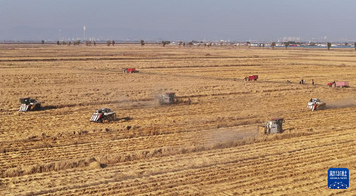 10月28日,農(nóng)民駕駛收割機(jī)在內(nèi)蒙古鄂爾多斯市達(dá)拉特旗昭君鎮(zhèn)沙圪堵村收獲水稻(無人機(jī)照片)。(新華社記者 賈立君 攝)