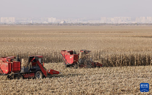 10月28日,農(nóng)民駕駛收割機(jī)在內(nèi)蒙古鄂爾多斯市達(dá)拉特旗收獲玉米。(新華社記者 賈立君 攝)