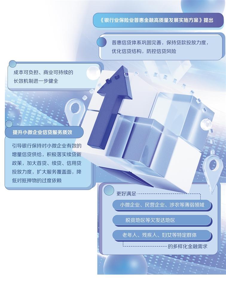 □ 本報記者 勾明揚 近年來,我國普惠金融發(fā)展取得長足進(jìn)步,金融服務(wù)的普惠性不斷提升。近期印發(fā)的《銀行業(yè)保險業(yè)普惠金融高質(zhì)量發(fā)展實施方案》(以下簡稱《實施方案》)在主要目標(biāo)中提出,普惠信貸體系鞏固完善,保持貸款投放力度,優(yōu)化信貸結(jié)構(gòu),防控信貸風(fēng)險,成本可負(fù)擔(dān)、商業(yè)可持續(xù)的長效機制進(jìn)一步健全,更好滿足小微企業(yè)、民營企業(yè)、涉農(nóng)等薄弱領(lǐng)域,脫貧地區(qū)等欠發(fā)達(dá)地區(qū)以及老年人、殘疾人、婦女等特定群體的多樣化金融需求。 “雪中送炭、服務(wù)民生”是普惠金融的題中之義。《實施方案》的印發(fā)將引導(dǎo)銀行業(yè)保險業(yè)進(jìn)一步提升普惠金融服務(wù)人民群眾生產(chǎn)生活的能力和水平。 查缺補漏完善體系 “普惠金融的初衷是為社會所有階層和群體提供金融服務(wù),實現(xiàn)經(jīng)濟(jì)的包容性增長?!闭新?lián)首席研究員董希淼告訴記者,在過去幾年普惠信貸規(guī)模快速增長、資產(chǎn)質(zhì)量壓力增大的情況下,金融機構(gòu)繼續(xù)推動普惠金融特別是普惠信貸高質(zhì)量發(fā)展時,一定程度上存在內(nèi)生動力不充足的問題,也存在外部激勵約束作用發(fā)揮不充分的問題。 中國郵政儲蓄銀行研究員婁飛鵬也表示,在發(fā)展普惠金融過程中,存在一些群體的合理金融需求特別是融資需求得不到有效滿足以及普惠金融服務(wù)不夠優(yōu)惠的問題。為此,需要重點圍繞滿足客戶群體合理融資需求的目標(biāo),從豐富抵質(zhì)押物類型、創(chuàng)新信用類貸款產(chǎn)品、利用數(shù)字技術(shù)線上作業(yè)降低金融服務(wù)成本等方面,為廣大客戶提供優(yōu)質(zhì)信貸服務(wù)。 國家金融監(jiān)督管理總局、中國人民銀行有關(guān)司局負(fù)責(zé)人在答記者問時說,《實施方案》明確,未來五年,基本建成高質(zhì)量綜合普惠金融體系,普惠金融促進(jìn)共同富裕邁上新臺階。普惠金融服務(wù)體系持續(xù)優(yōu)化,普惠信貸體系鞏固完善,普惠保險體系逐步健全。 “作為3項重點工作任務(wù)之一,鞏固提升普惠信貸體系和能力的核心在于夯實基礎(chǔ)并優(yōu)化效能,這為更好發(fā)展普惠金融指明了方向?!敝袊y行研究院研究員吳丹認(rèn)為,接下來需要夯實普惠信貸的現(xiàn)有基礎(chǔ),運用大數(shù)據(jù)、人工智能優(yōu)化風(fēng)控與服務(wù)效率,增強風(fēng)控精準(zhǔn)性、降低運營成本,加強技術(shù)賦能對傳統(tǒng)服務(wù)短板的補足效應(yīng)。還需要增強普惠信貸服務(wù)能力,擴(kuò)展服務(wù)網(wǎng)絡(luò),提升觸達(dá)效率,適配滿足長尾客群差異化需求的創(chuàng)新產(chǎn)品。 董希淼補充道,可以從體制機制、基礎(chǔ)設(shè)施、產(chǎn)品服務(wù)、考核激勵等方面采取針對性措施。比如,改進(jìn)普惠信貸服務(wù)考核體系,破解融資難和融資貴問題;拓寬商業(yè)銀行特別是中小銀行不良資產(chǎn)處置的渠道,豐富處置方式和手段;加大對商業(yè)銀行特別是中小銀行的正向激勵,同時防范信貸供給過度和資金被挪用等問題?!敖鹑跈C構(gòu)應(yīng)根據(jù)自身的資源稟賦,選擇適合的普惠信貸服務(wù)模式?!倍m嫡f。 服務(wù)質(zhì)效不斷提升 完善普惠信貸管理體系,是推動普惠金融高質(zhì)量發(fā)展的重要一環(huán)?!秾嵤┓桨浮诽岢觯⒔∪ㄐ∥⑵髽I(yè)、民營企業(yè)、“三農(nóng)”、重點幫扶群體在內(nèi)的普惠信貸體系,科學(xué)設(shè)定監(jiān)管目標(biāo),加強監(jiān)測督導(dǎo)。完善監(jiān)管評價評估機制、信貸政策導(dǎo)向效果評估機制,優(yōu)化指標(biāo)設(shè)置,突出實效評價,強化結(jié)果運用。及時修訂普惠信貸監(jiān)管制度,優(yōu)化發(fā)展環(huán)境、促進(jìn)可持續(xù)發(fā)展。 婁飛鵬認(rèn)為,這些舉措將提升金融監(jiān)管質(zhì)效,通過完善評估機制,更好地引導(dǎo)金融機構(gòu)加大普惠金融發(fā)展力度、提升發(fā)展質(zhì)量,將普惠金融高質(zhì)量發(fā)展落到實處。 作為國民經(jīng)濟(jì)重要主體,小微企業(yè)是普惠金融服務(wù)的重點對象?!秾嵤┓桨浮访鞔_提出,提升小微企業(yè)信貸服務(wù)質(zhì)效。引導(dǎo)銀行保持對小微企業(yè)有效的增量信貸供給,積極落實續(xù)貸新政策,加大首貸、續(xù)貸、信用貸投放力度,擴(kuò)大服務(wù)覆蓋面,降低對抵押物的過度依賴。提高小微企業(yè)融資服務(wù)定價管理能力,促進(jìn)綜合融資成本穩(wěn)中有降。 中國人民銀行發(fā)布的2025年一季度金融機構(gòu)貸款投向統(tǒng)計報告顯示,今年一季度末,人民幣普惠小微貸款余額34.81萬億元,同比增長12.2%,增速比各項貸款高4.8個百分點,一季度增加1.9萬億元。其中,對科技型中小企業(yè)的支持尤為明顯。 甘肅皓天醫(yī)藥科技有限公司(簡稱“皓天醫(yī)藥”)是一家專注于化學(xué)原料藥、醫(yī)藥中間體研發(fā)、生產(chǎn)與銷售的國家級高新技術(shù)企業(yè)。作為生物醫(yī)藥產(chǎn)業(yè)鏈上游供應(yīng)商,皓天醫(yī)藥為國內(nèi)外大型醫(yī)藥工廠及眾多下游藥企提供關(guān)鍵的醫(yī)藥中間體和原料藥。隨著業(yè)務(wù)規(guī)模不斷擴(kuò)大,企業(yè)面臨的資金周轉(zhuǎn)壓力也隨