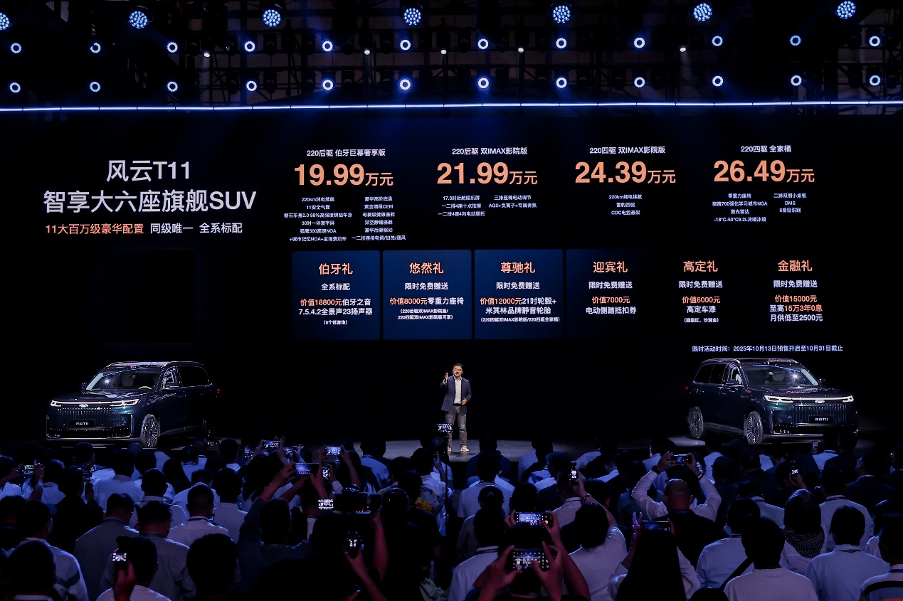 10月13日,以“兌現(xiàn)”為主題的風(fēng)云T11家庭品鑒日暨預(yù)售發(fā)布會(huì)在安徽蕪湖圓滿(mǎn)收官。作為風(fēng)云品牌煥新后的首款旗艦級(jí)SUV,風(fēng)云T11定位為“智享大六座旗艦SUV”。新車(chē)以“頂格對(duì)標(biāo)”為理念,憑借“超大更好”四大核心價(jià)值、三大沉浸式場(chǎng)景與11大全系標(biāo)配,兌現(xiàn)用戶(hù)對(duì)品質(zhì)生活的全維期待。