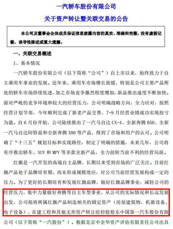 根據(jù)此前公告,一汽轎車根據(jù)資產(chǎn)評估的結(jié)果,在和一汽集團(tuán)協(xié)商一致的前提下,將評估價(jià)值為3.7億元的紅旗旗下資產(chǎn),以含增值稅人民幣 4.2億元的交易價(jià)格轉(zhuǎn)讓給一汽股份,并且表示, 本次資產(chǎn)轉(zhuǎn)讓的關(guān)聯(lián)交易已經(jīng)在第七屆董事會(huì)第七次會(huì)議中審議通過,在交易合同簽署生效后20天內(nèi)一汽股份需要向一汽轎車支付轉(zhuǎn)讓資產(chǎn)價(jià)款。這意味著,紅旗品牌已歸屬于一汽股份所有,從一汽轎車中獨(dú)立出來。(圖/文 網(wǎng)通社 陳旭明) (責(zé)任編輯:梁艷) |