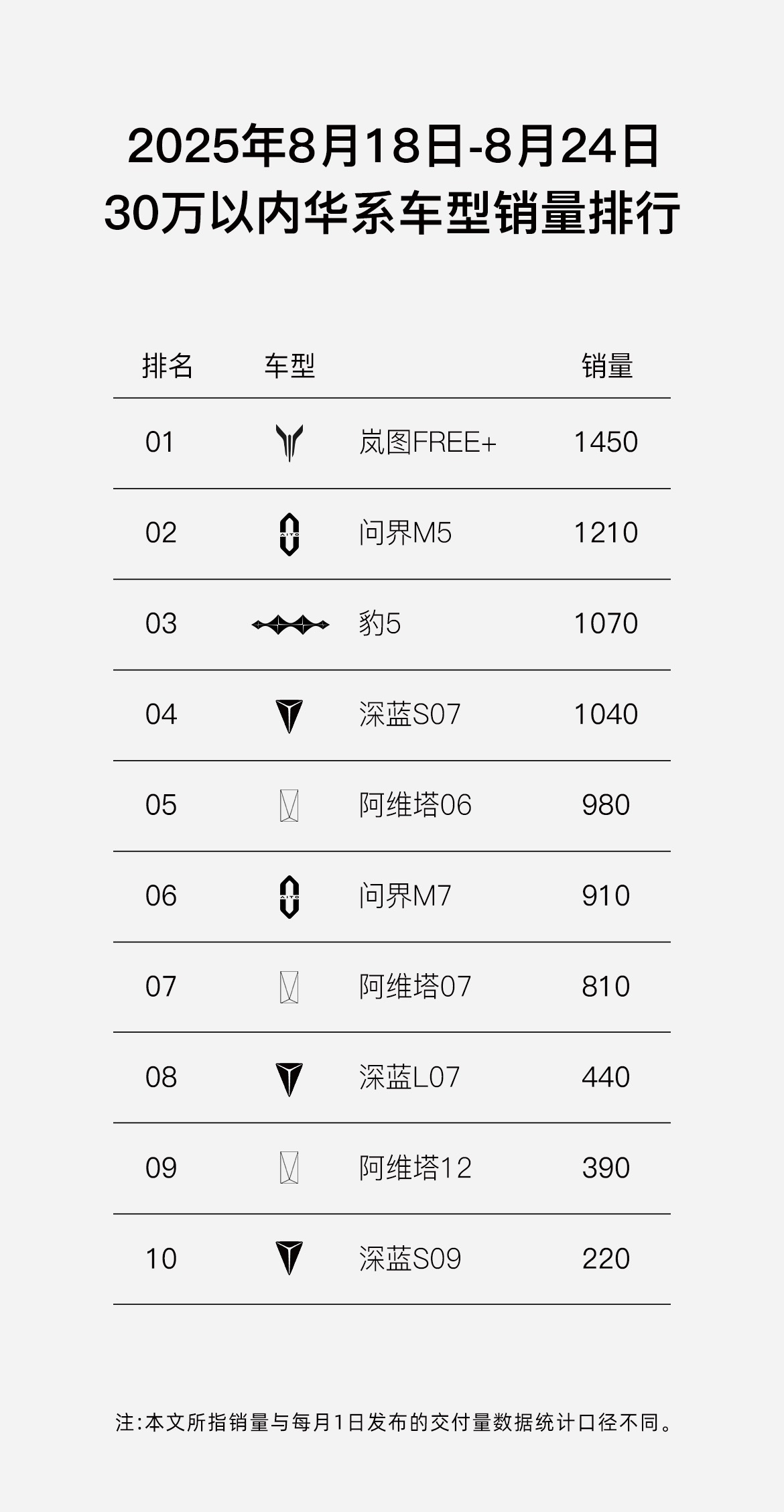 央廣網(wǎng)北京8月27日消息(記者姜鵬)8月第三周(8月18日-8月24日),嵐圖FREE+再創(chuàng)銷量佳績:?jiǎn)沃茕N量達(dá)到1450輛,再次奪得第34周“30萬內(nèi)華系車型銷冠”,并強(qiáng)勢(shì)躋身20-30萬級(jí)混動(dòng)SUV銷量 Top2。截至8月24日,嵐圖FREE+當(dāng)月累計(jì)銷量已達(dá)4110輛,穩(wěn)坐30萬以內(nèi)華系車型銷量Top1。