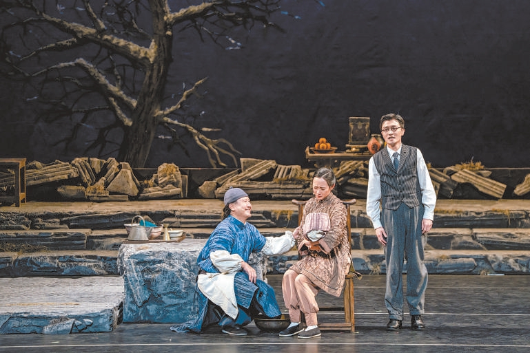 舞臺地面也由過去的雪地變成了石板地。石板形象參考了“圓明園”的石頭形制,隱喻著“石頭很頑強,雖然被摧殘過,但是它依然在,并且會一直存在下去”。臺前幾盆老舍先生最愛的菊花,也依舊開得繁盛。