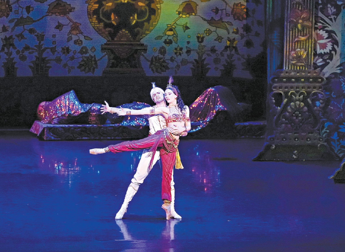 指揮家阿尤布·古利耶夫揮棒,打擊樂(lè)率先起勢(shì),以靈動(dòng)音色牽引出中央芭蕾舞團(tuán)交響樂(lè)團(tuán)演奏的異域旋律。濃郁的阿拉伯風(fēng)情從聽覺(jué)延伸至雙眼,舞臺(tái)上,大幕升起,色彩圖案極盡斑斕的影像交織成一冊(cè)《一千零一夜》的圖書,書頁(yè)翻動(dòng),故事流轉(zhuǎn),奇幻的傳說(shuō)走出圖畫,來(lái)到觀眾眼前。8月23日至25日,馬林斯基劇院芭蕾舞團(tuán)濱海分院攜芭蕾舞劇《一千零一夜》登臺(tái)北京藝術(shù)中心,向觀眾展開了一個(gè)極致華麗璀璨的奇幻世界。
