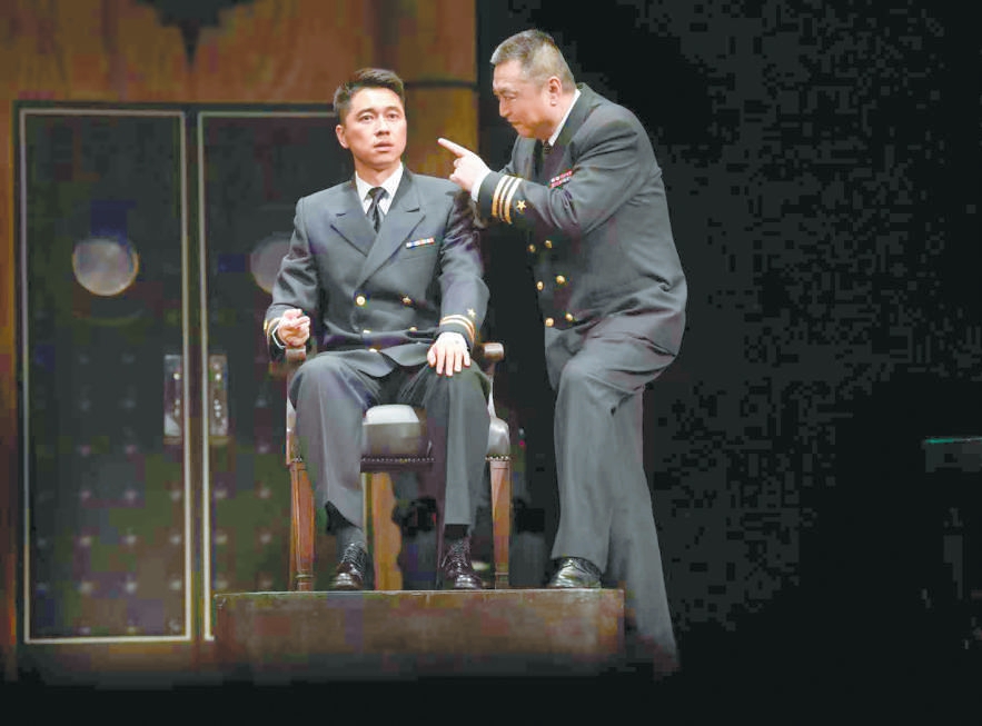 于觀眾而言,戲骨飆戲是《嘩變》格外精彩的看點(diǎn),無論是制造了“草莓事件”“黃色燃料事件”“電咖啡壺事件”等一系列“鬧劇”的艦長魁格、以“詭計(jì)”掌控全場(chǎng)節(jié)奏的律師格林渥,還是圖窮匕見、老謀深算的基弗,抑或每一個(gè)各懷目的、性格鮮明的角色,他們之間起伏有致的銜接是對(duì)演員表演功底的極大考驗(yàn)。飾演魁格的馮遠(yuǎn)征把《嘩變》總結(jié)為一場(chǎng)“坐著把戲演好”的挑戰(zhàn),全劇除了格林渥與檢察官可以走動(dòng),其他所有人幾乎坐著演完全程,如何把臺(tái)詞說得詳細(xì)、說得抓人,同時(shí)靠說就把角色塑造到位,是演員需要日日精進(jìn)的功課,也是觀眾愿意一再為之奔赴而來的重要理由。