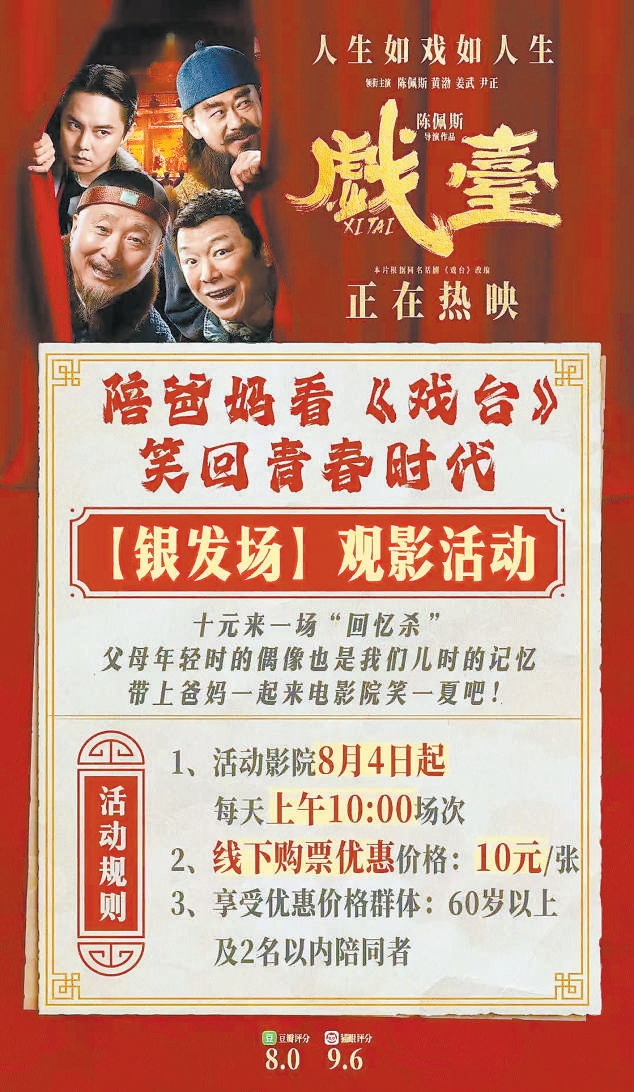 《戲臺(tái)》則推出“銀發(fā)場(chǎng)”特惠活動(dòng)。“效果特別好,線上線下都傳開(kāi)了,很多觀眾打電話來(lái)咨詢。”馮賀楠說(shuō),北京大約四分之一的影院都有“銀發(fā)場(chǎng)”,他所在影院的“銀發(fā)場(chǎng)”上座率在《戲臺(tái)》所有場(chǎng)次中是最高的。 (北京晚報(bào)記者 袁云兒)