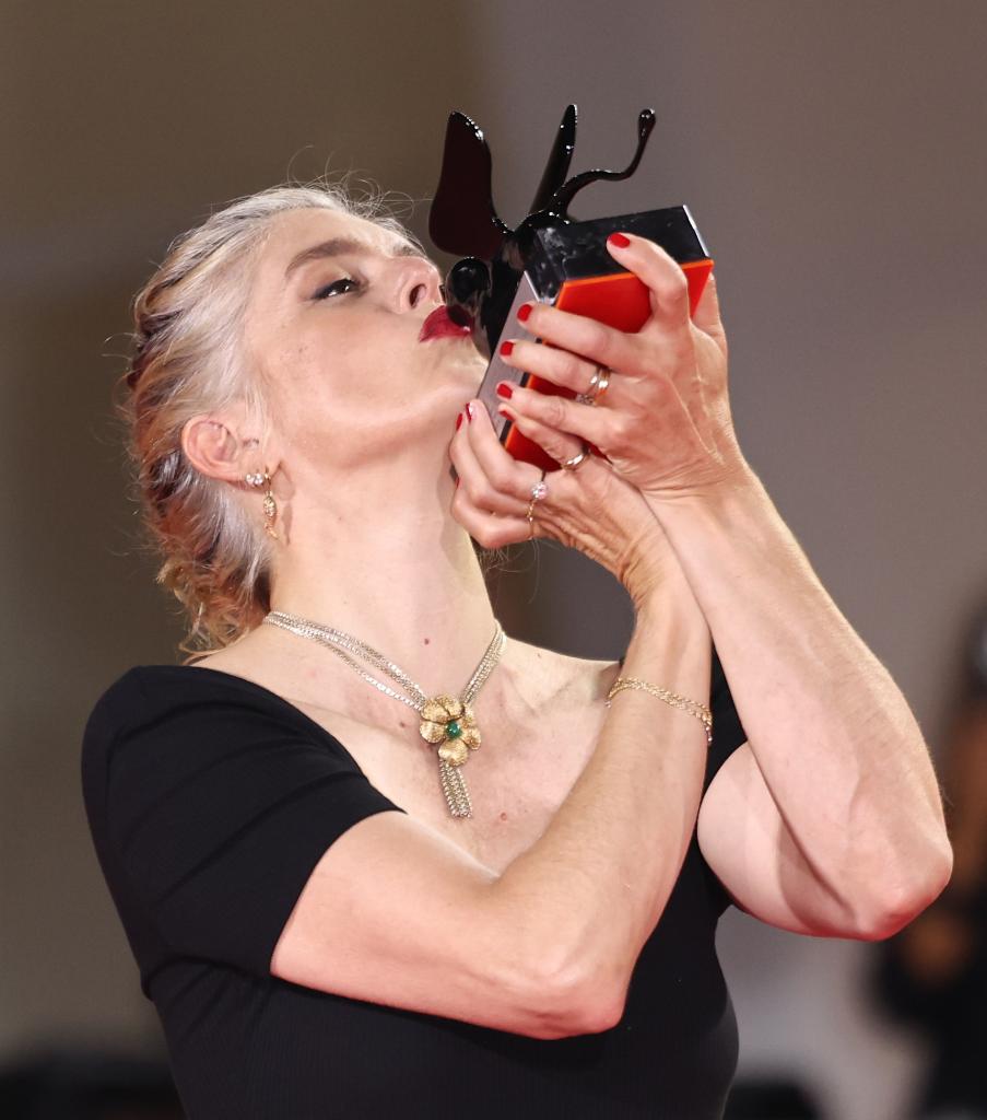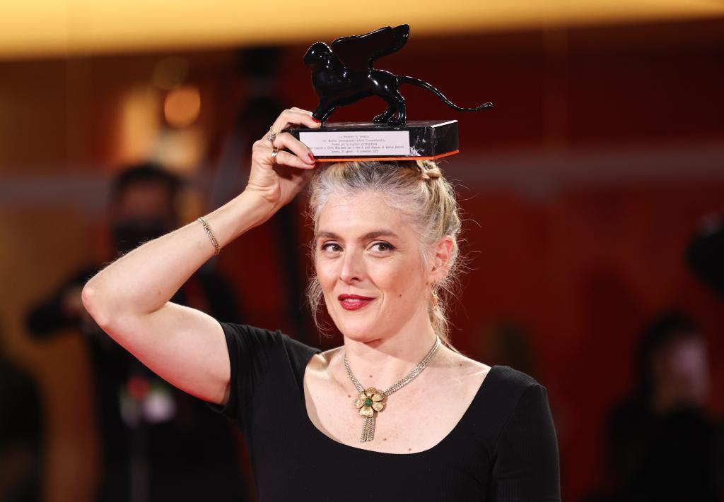 9月6日,在意大利威尼斯,最佳劇本獎(jiǎng)獲得者、電影《執(zhí)筆》導(dǎo)演瓦萊麗·唐澤利與獎(jiǎng)杯合影。新華社記者 李京 攝