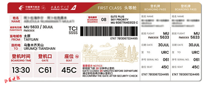 此次升級不僅注重文化表達(dá),更著力提升服務(wù)體驗(yàn)。登機(jī)牌對登機(jī)口、起飛時(shí)間、座位號等關(guān)鍵信息進(jìn)行了“放大提亮”處理,通過字體加粗、色彩對比等設(shè)計(jì),顯著提升了信息辨識度,特別方便老年旅客快速獲取信息,有效降低誤機(jī)風(fēng)險(xiǎn),體現(xiàn)了東航精細(xì)化服務(wù)理念。