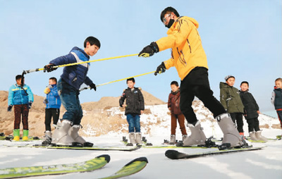 圖為在甘肅省山丹縣佛山滑雪場,近百名中小學(xué)生正在滑雪教練的指導(dǎo)下體驗冰雪運動樂趣。張 淵 攝(人民視覺)