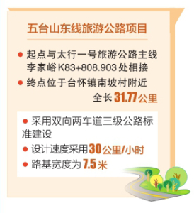 五臺山東線旅游公路起點與太行一號旅游公路主線李家峪K83+ 808.903處相接,終點位于臺懷鎮(zhèn)南坡村附近,全長31.77公里,采用雙向兩車道三級公路標準建設,設計速度采用30公里/小時,路基寬度為7.5米。項目實施圍繞“扶貧、旅游、生態(tài)、人文、研學”等核心宗旨,著力提升五臺山風景名勝區(qū)旅游公路的通行能力與服務水平,強化“交通+旅游”與“經(jīng)濟增長”的導向作用。