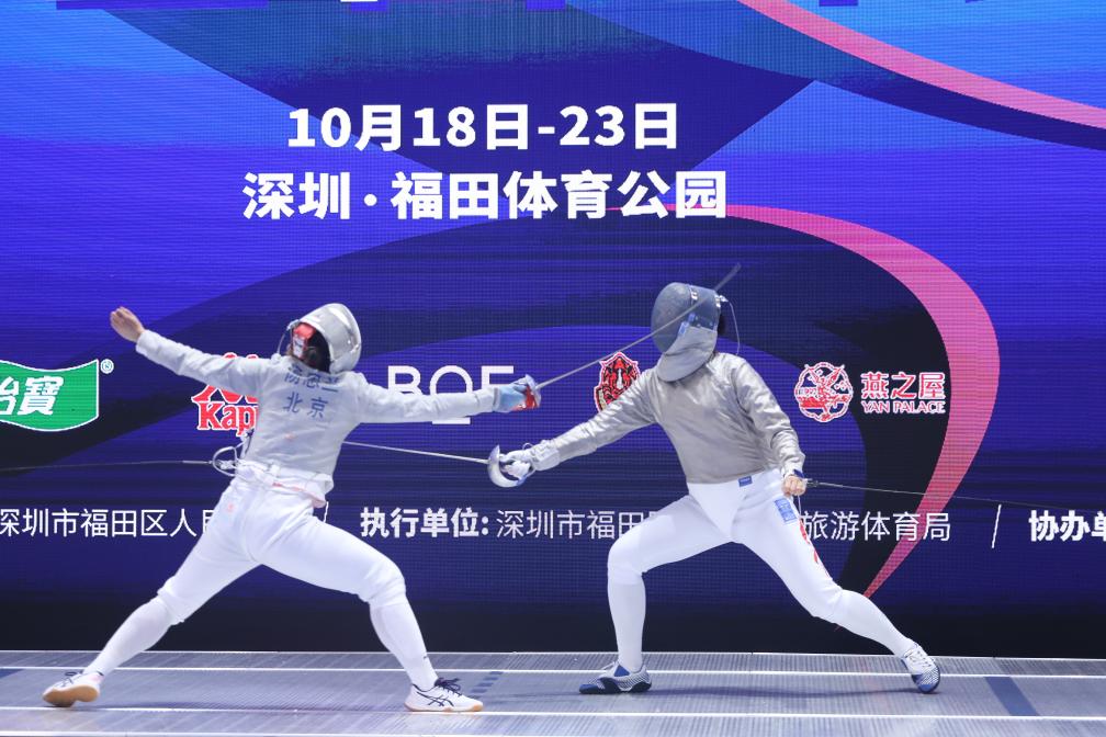 湯恩蘭(左)在女子佩劍個(gè)人決賽中對(duì)陣邵雅琦。圖片來(lái)自中國(guó)擊劍協(xié)會(huì)