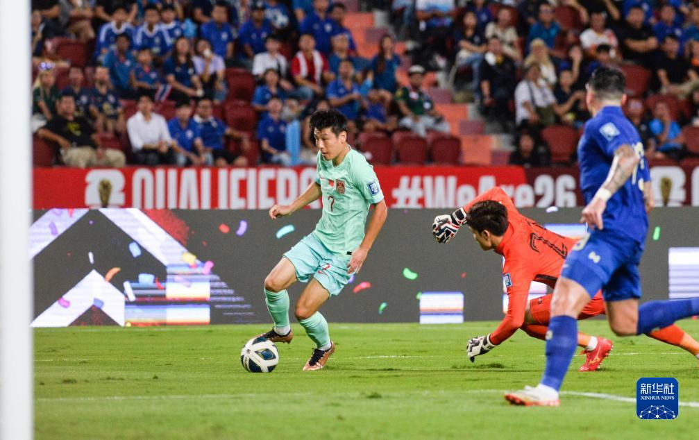 11月16日,中國隊球員武磊(左)在比賽中進攻。當(dāng)日,在泰國曼谷舉行的2026世界杯預(yù)選賽亞洲區(qū)36強賽C組比賽中,中國隊以2比1戰(zhàn)勝泰國隊。新華社發(fā)(拉亨攝)
