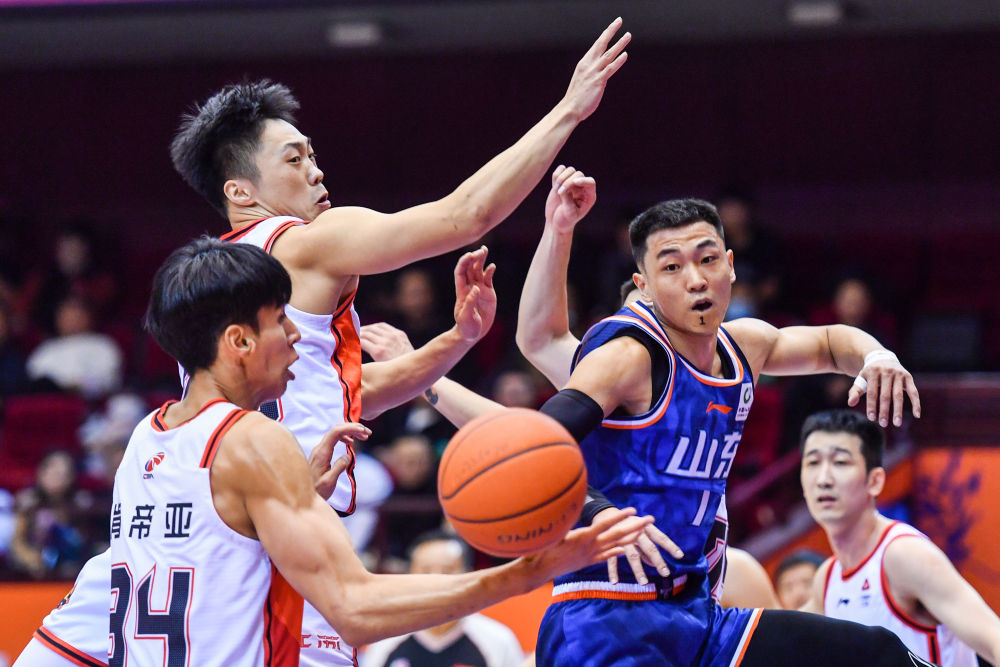 12月7日,山東隊球員高詩巖(前右)在比賽中傳球。新華社記者 朱崢 攝