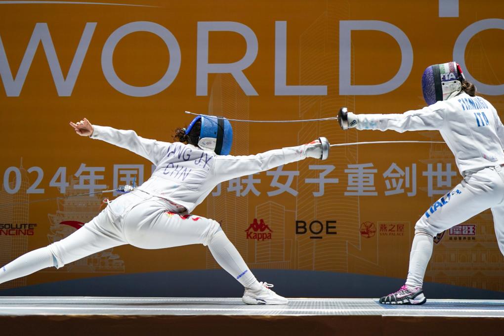 當日的團體賽中,兩隊首輪輪空后在八分之一決賽相遇。由東京奧運會冠軍孫一文和三名年輕小將唐君瑤、余思涵和許諾組成的中國隊開局后一路領先,最終以45:33戰(zhàn)勝中國香港隊。