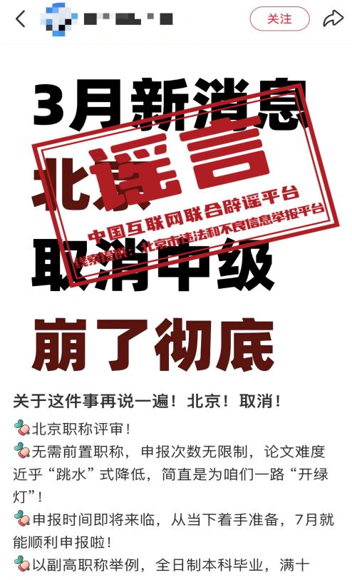 詳情:近期,2025年度職稱評審工作啟動后,網(wǎng)上流傳“北京取消中級職稱”的說法。經(jīng)核實(shí),此言論不實(shí),中級職稱并未取消。據(jù)北京市人社局介紹,申報人可以對照初級、中級、高級職稱不同層級的要求,根據(jù)自身情況申請職稱評審。不同系列的職稱申報具體要求不同,以工程技術(shù)系列為例,本科畢業(yè)需要先取得中級職稱,獲評中級職稱后從事本專業(yè)技術(shù)工作滿5年,才能申報高級職稱。(來源:“北京網(wǎng)絡(luò)舉報”微信公眾號)
