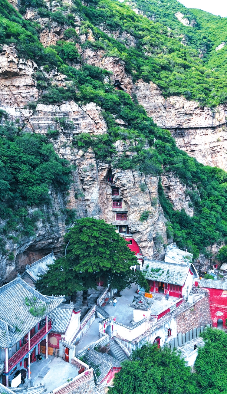 入山門,穿行于北洞區(qū)。彌勒洞高踞峭壁,殿宇凌空,數(shù)百級石階如天梯垂掛,為朝山第一洞天。彌勒祖笑坐蓮臺俯瞰塵寰。四大天王分別手持清風劍、琵琶、雨傘和蜃,象征風、調(diào)、雨、順。前行不遠,支腰石突兀而生。支腰石又名下馬石,為官騎馬者唯于此棄鐙,方可入觀進香。相傳有位虔誠老者至此,累得腰酸腿疼氣喘吁吁,無意間以樹枝支撐石縫,痛楚頓消,自此“支腰石”故事得以流傳。過了支腰石,碑林長廊依山逶迤,三十通古碑靜默矗立。趙杲觀,這座曾經(jīng)的道教清修之所,在歷史的斷層中,完成了一場關(guān)于“消逝”與“存在”的對話。