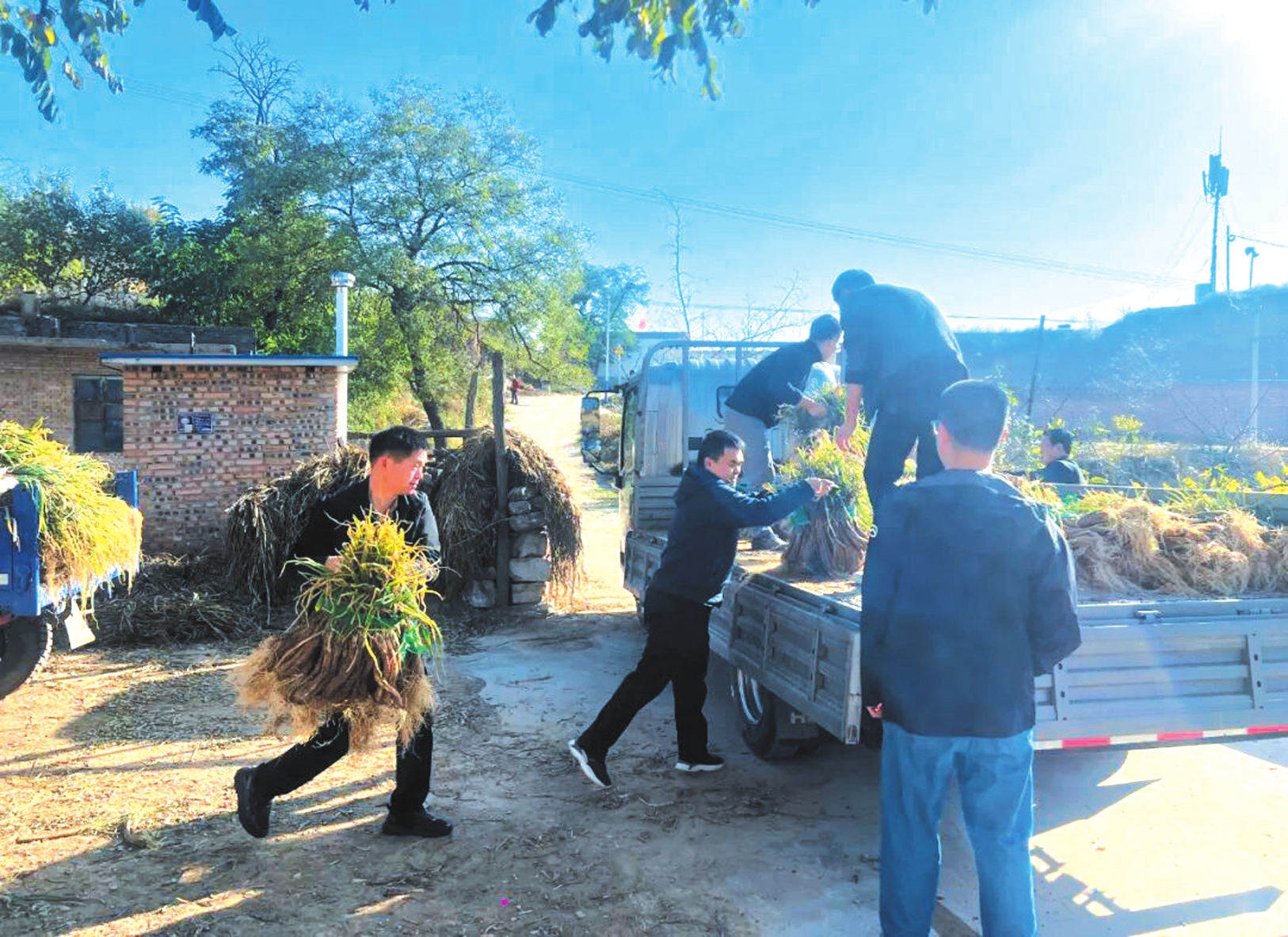 村里的部分孤寡老人,子女不在身邊,又缺乏交通工具,辛苦種植的紅蔥只能依賴商販來村定點(diǎn)收購,價格也不太理想。駐村第一書記阮傳飛說:“不能讓老百姓的汗白流,我們作為駐村的黨校人要行動起來!”于是帶領(lǐng)隊員們化身“快遞員、裝卸工”,開著貨車與村干部一起來到農(nóng)戶門前,直接將紅蔥裝車運(yùn)往忻州市區(qū)銷售,打通紅蔥從農(nóng)田到餐桌的直銷通道。隊員們分工協(xié)作,稱重、捆綁、搬運(yùn)、碼放,汗水混著泥土浸濕了衣背卻無人停歇。一上午的工夫,就裝了滿滿一車。顧不得短暫休息,隊員們又馬不停蹄地趕往市區(qū),爭取在天黑前運(yùn)回市里進(jìn)行售賣。丁家溝75歲的焦大爺激動地說:“多虧了這些駐村干部和年輕同志,要不是他們幫我想辦法,我這些蔥得啥時候才能賣出去??!”