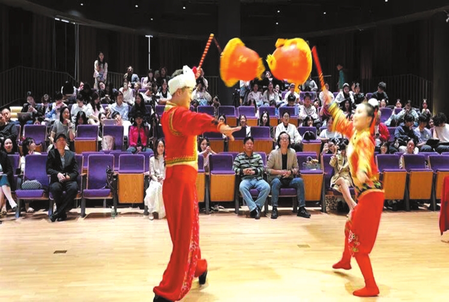 活動現(xiàn)場,藝術團團長劉延鳳作為主講人,將黃河岸邊的千年回響娓娓道來。她從“戶有弦歌新治譜”的記載,講到被列入國家級非遺的榮光;從高亢遼闊、自由奔放的“山曲”風味,解析融合三省民間音樂元素的“二人臺”小戲的獨特魅力。多位優(yōu)秀演員聯(lián)袂登臺,他們用精湛的技藝將這份厚重的文化遺產(chǎn)鮮活呈現(xiàn)。市級非遺代表性傳承人鄔光演唱的《放羊漢唱起爬山調(diào)》,一聲出口,仿佛將黃土高原的溝壑縱橫與黃河的奔騰不息盡數(shù)帶到現(xiàn)場;優(yōu)秀青年演員王佳、楊慧、鄔強等演繹的《河曲人愛把山曲唱》《打藍靛》《壓糕面》等多首河曲民歌二人臺的經(jīng)典曲目與劇目,展現(xiàn)了民間生活的喜怒哀樂,濃郁的鄉(xiāng)土氣息與真摯情感深深打動了在場師生。