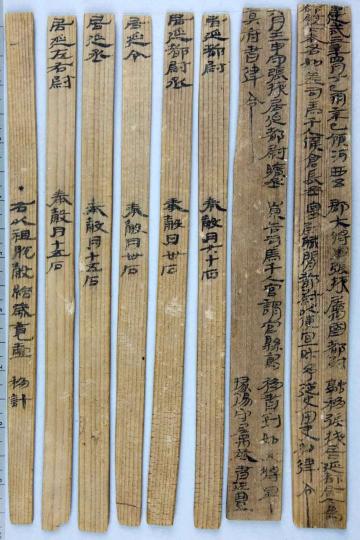 “建武三年四月丁巳朔辛巳,領(lǐng)河西五郡大將軍張掖屬國都尉融移張掖居延都尉,今為都尉以下奉各如差,司馬千人候倉長丞塞尉職閑,都尉以便宜財予,從史田吏如律令……”出土于內(nèi)蒙古額濟納旗甲渠候官遺址的《建武三年居延都尉吏奉例》由10枚簡組成,每簡長22.8厘米,前兩簡寬2.5厘米、其余8簡寬1.4厘米,全文200字。