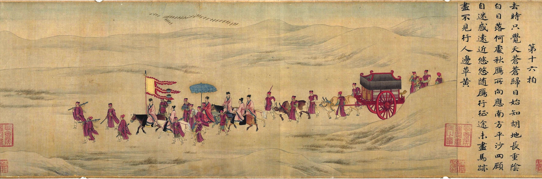 通過(guò)出土和存世的一些圖像,我們可以一窺漢代旄節(jié)之真容。洛陽(yáng)燒溝61號(hào)西漢壁畫墓中的壁畫磚上繪有一持節(jié)使者;山東嘉祥武氏祠一組畫像中,描繪了漢使持節(jié)拜見(jiàn)王陵之母的場(chǎng)景,手中所持之節(jié)正是旄三重,只是看起來(lái)柄長(zhǎng)不到八尺。至于“旄節(jié)之制”,漢代與先秦當(dāng)是有別的,將旄牛尾編成三重流蘇的制節(jié)之法始于漢,《事物紀(jì)原》載:“漢人有持節(jié),乃古旄也。然則節(jié)自周始,而旄節(jié)則起于漢也。”這種持節(jié)使的形象,在南宋人所繪《胡笳十八拍》和《迎鑾圖》等表現(xiàn)外交題材的畫作中,仍有清晰體現(xiàn),可見(jiàn)這種持節(jié)出使的制度在古代一直延續(xù)。
