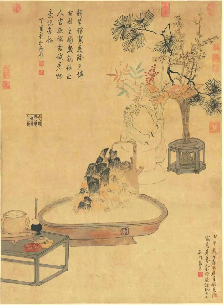 明代文人插花還追求古樸淡雅之美,這首先體現(xiàn)在花材的選配層面。明代張謙德所撰的插花藝術(shù)專著《瓶花譜》中載:“瓶中插花,止可一種、兩種,稍過(guò)多便冗雜可厭?!被ú牡臄?shù)量要盡可能精簡(jiǎn),追求以少勝多?;縿t以梅、蓮、蘭、菊等品格清高者為首選,正如明代袁宏道著《瓶史》所記:“取之雖近,終不敢濫及凡卉,就使乏花,寧貯竹柏?cái)?shù)枝以充之?!边@樣的美學(xué)觀念可見于明代畫家張宏所繪《歲朝圖》中的一組文人插花,畫面遠(yuǎn)景的青銅花觚中置松枝、蠟梅、山茶各一,白色瓷瓶中僅插有南天竹與水仙,高腳缽中則擺放數(shù)朵佛手,與花卉相互呼應(yīng)。畫中所選花材皆為上品,讓一室之內(nèi)頓生林壑之幽。