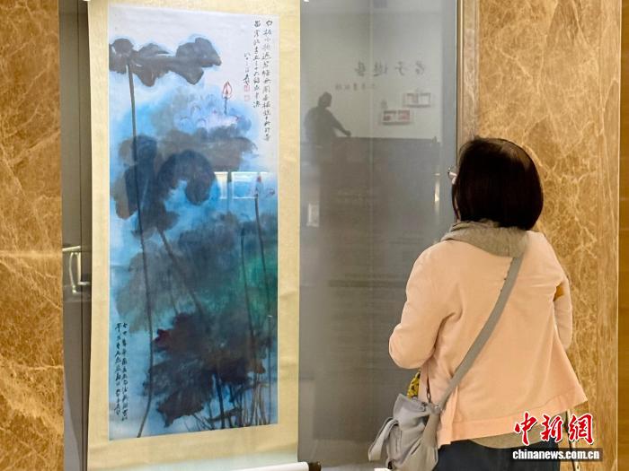 11月4日,于右任、徐悲鴻、張大千等名家書畫臺北展出。圖為觀眾駐足欣賞張大千畫作《潑彩荷花》。中新社記者 朱賀 攝