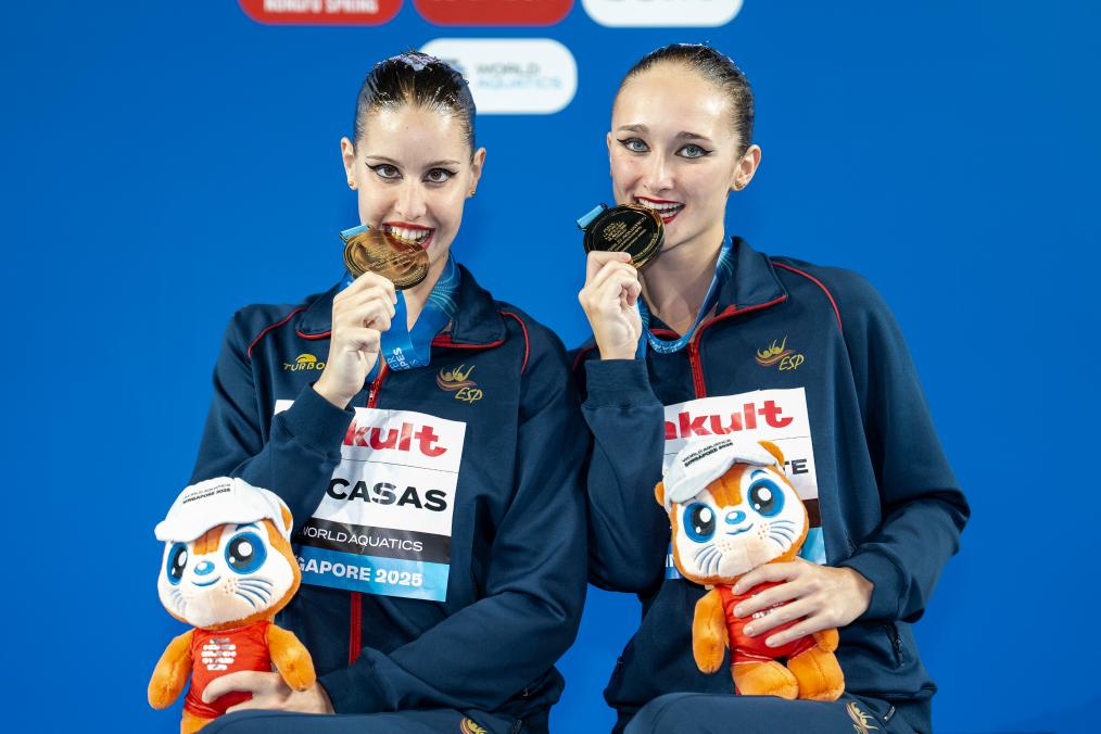 新華社新加坡7月24日電(記者岳晨星、王子江)在24日進行的新加坡游泳世錦賽花樣游泳女子雙人自由自選比賽中,西班牙組合瓦萊特/卡薩斯奪得金牌,意大利選手皮科利/魯杰羅、來自俄羅斯的中立運動員組合多羅什科/蓋達伊分獲第二、三名。中國隊選手林彥含/林彥君排名第四。
