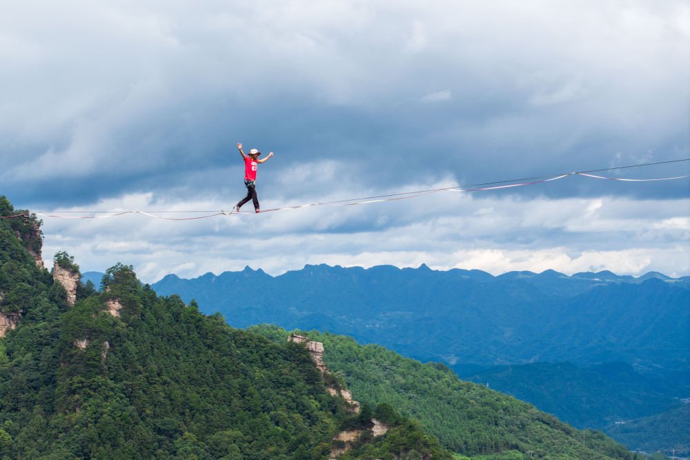 本次高空扁帶賽吸引了來自中國、法國、德國、美國等10個國家和地區(qū)的20名頂尖扁帶選手參加。扁帶架設(shè)在黃石寨景區(qū)“師徒會”景點(diǎn)和金鞭溪景區(qū)的琵琶峰之間,海拔高度1092米,扁帶架設(shè)總長1600米,是世界目前行走難度系數(shù)極高、地理環(huán)境極為復(fù)雜的高空扁帶。