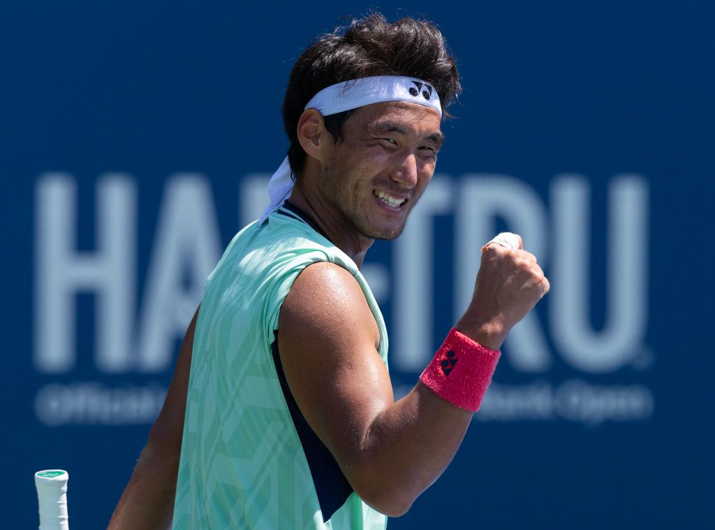 7月28日,中國選手布云朝克特在比賽后慶祝勝利。當日,在多倫多舉行的2025年加拿大國家銀行網球公開賽男單首輪比賽中,中國選手布云朝克特2比0戰(zhàn)勝捷克選手科普里瓦,晉級第二輪。新華社發(fā)(鄒崢攝)