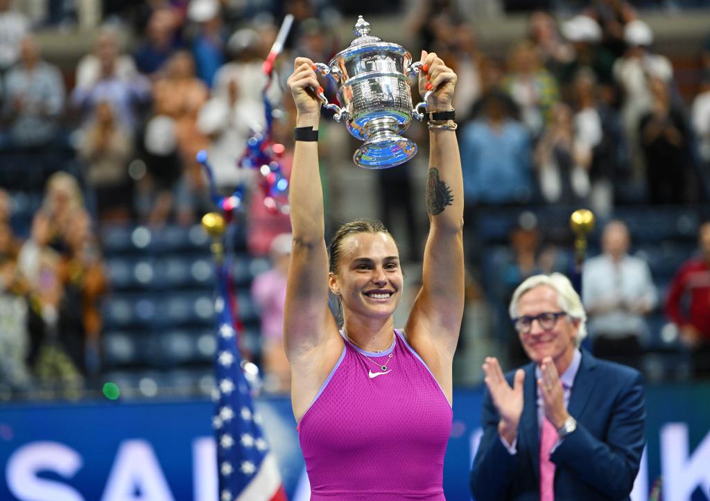 2024年9月7日,薩巴倫卡在頒獎儀式上高舉獎杯。當日,在2024美國網球公開賽女子單打決賽中,白俄羅斯選手薩巴倫卡2比0戰(zhàn)勝美國選手佩古拉,獲得冠軍。新華社記者 李睿 攝