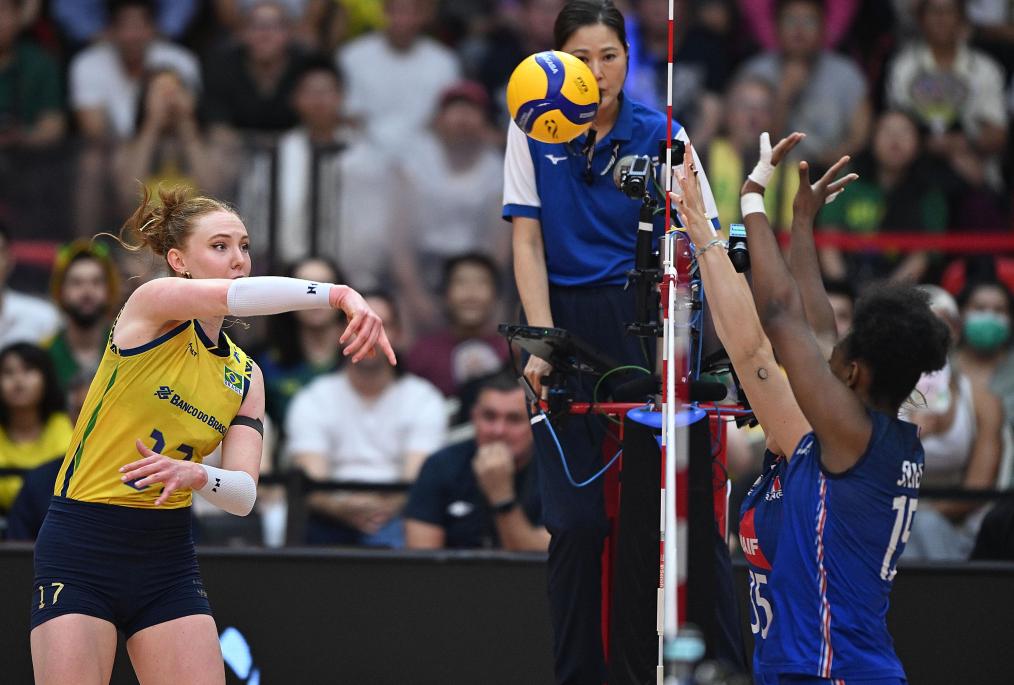 巴西隊(duì)在小組賽中曾以3:2險(xiǎn)勝法國(guó)隊(duì),這次她們以27:25、33:31和25:19勝出。前兩局的爭(zhēng)奪異常激烈,第二局更是一波三折。法國(guó)隊(duì)一度取得19:15的優(yōu)勢(shì),卻被巴西隊(duì)連得4分追成19平。此后,巴西隊(duì)以24:22率先拿到局點(diǎn),卻被法國(guó)隊(duì)連得3分以25:24反超。領(lǐng)先幾度易手、雙方又多次錯(cuò)過(guò)局點(diǎn)之后,比分來(lái)到31平。關(guān)鍵時(shí)刻,庫(kù)迪耶斯扣球成功,接下來(lái)加比在反擊中推攻得分,幫助巴西隊(duì)以33:31險(xiǎn)勝。