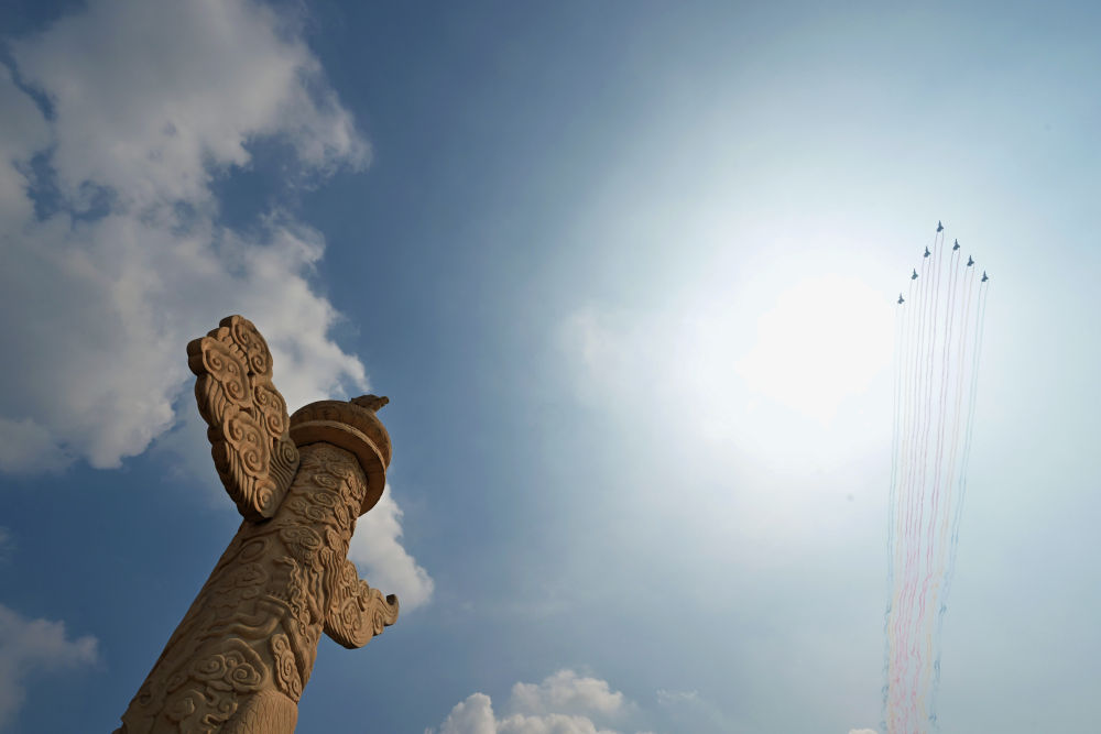 9月3日,紀(jì)念中國人民抗日戰(zhàn)爭暨世界反法西斯戰(zhàn)爭勝利80周年大會在北京隆重舉行。這是空中護(hù)旗梯隊(duì)接受檢閱。新華社記者 王婧嬙 攝