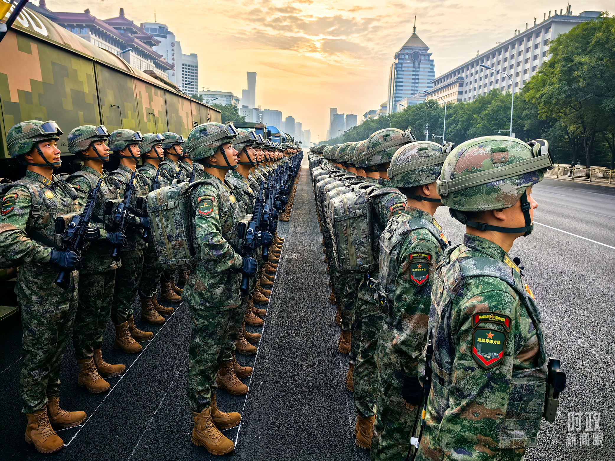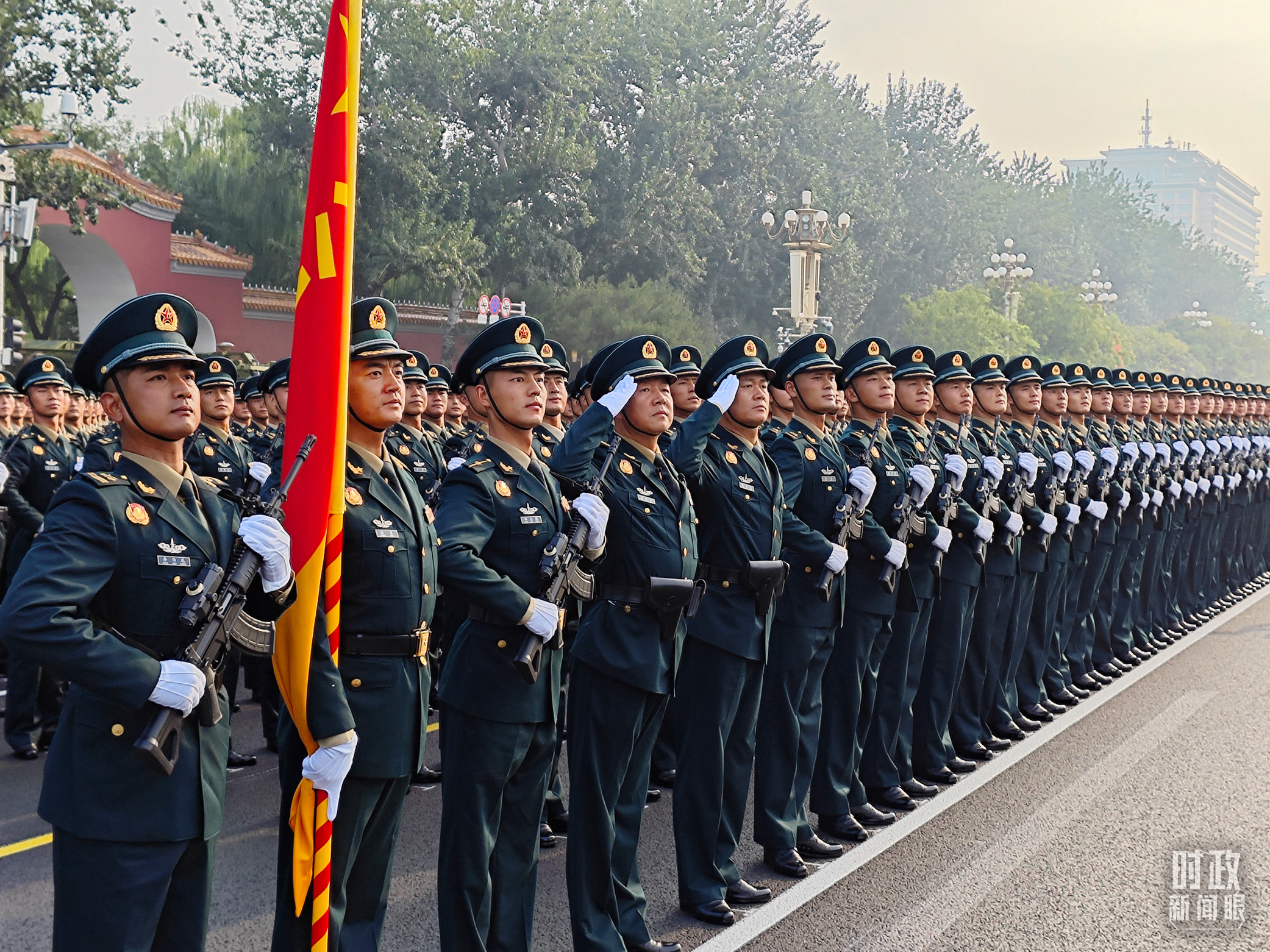 9月3日上午,紅日東升,霞光灑滿北京長安街,45個受閱方(梯)隊整齊列隊。天安門廣場上旌旗獵獵,氣象恢宏。