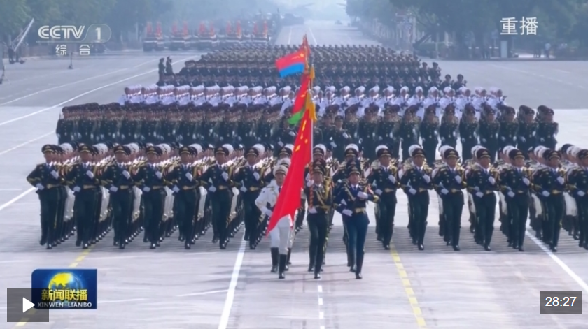 80響禮炮震徹云霄。全場齊聲高唱國歌,勝利紀念日的五星紅旗冉冉升起,飄揚在天安門廣場上空。