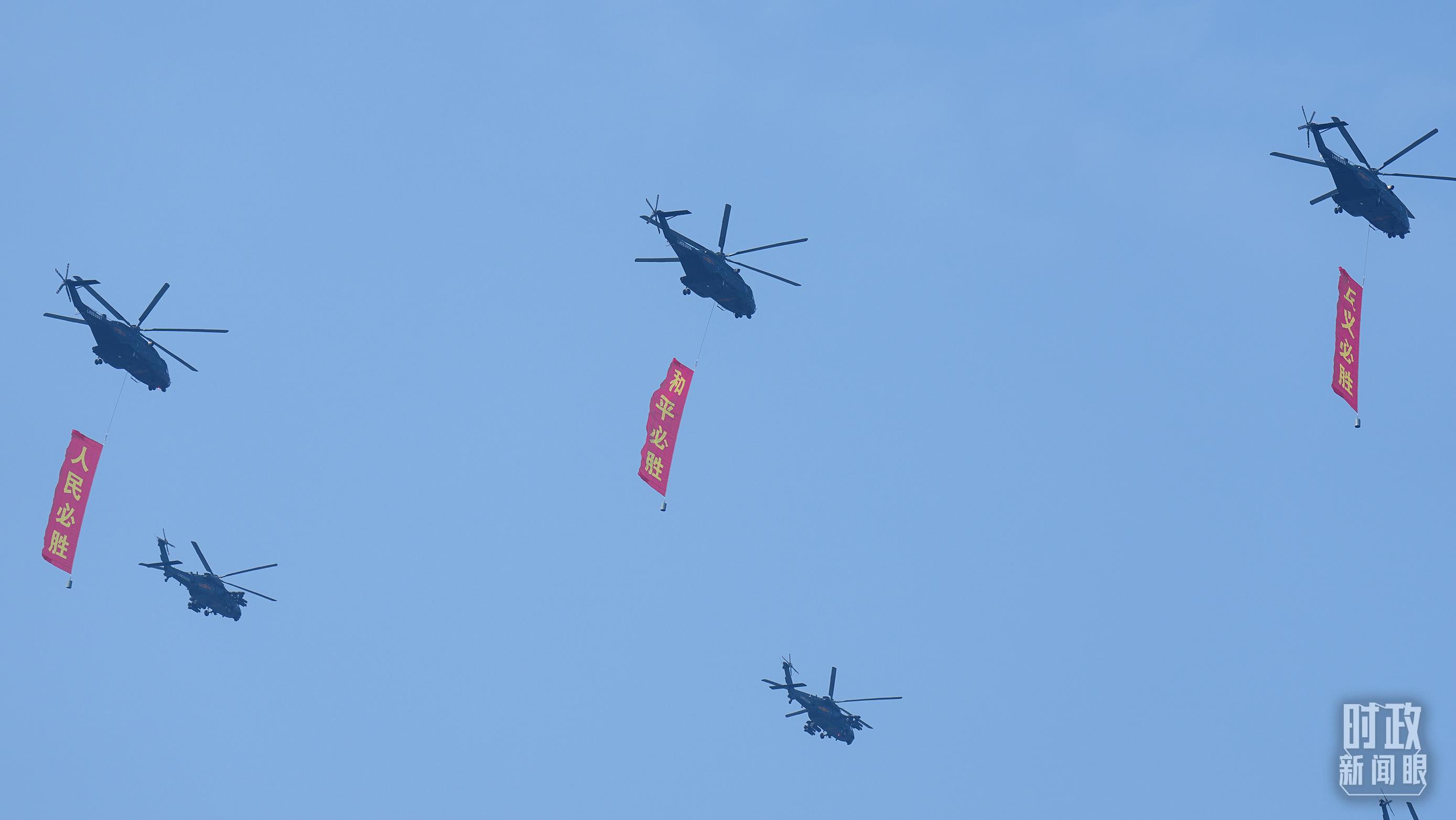 △9月3日,3架直升機(jī)分別懸掛“正義必勝”“和平必勝”“人民必勝”條幅飛過(guò)天安門(mén)廣場(chǎng)。(總臺(tái)記者李晉拍攝)